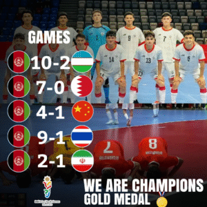 تیم ملی فوتسال زیر ۱۷ سال افغانستان با عملکردی درخشان توانست در دیداری هیجانانگیز، تیم قدرتمند ایران را با نتیجهٔ ۲–۱ شکست دهد و عنوان قهرمان بازیهای آسیایی جوانان ۲۰۲۵ را از آن خود کند.
